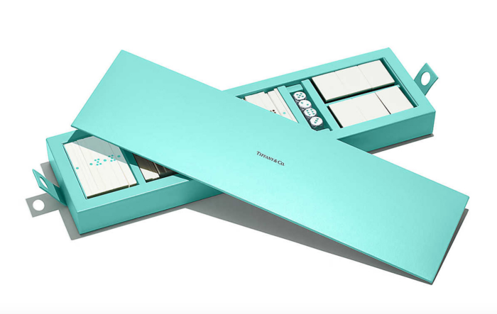 珠宝品牌对每一个牌都强调了精致,美国胡桃木底座、Tiffany 蓝色的夹层和白色牌面,每个牌上的刻纹都经过了设计,和传统的牌比较起来多了一丝艺术风格。整组牌一样包含了筹码、骰子和计分棒,不过就是加入了金属的加入,还有Tiffany Blue的多次出现,更能显现出品牌的气质。