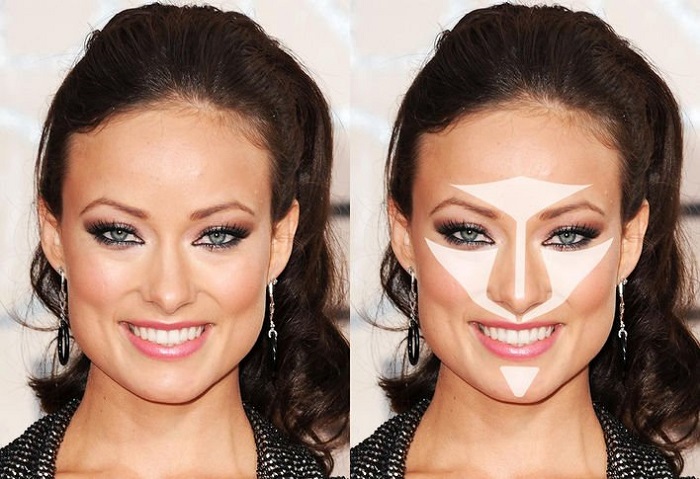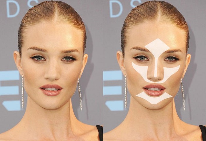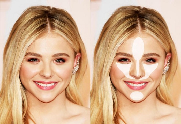 较为圆润但下巴较尖的脸型叫作「心形脸」,由于脸颊多肉,容易显出 babyfat 的感觉,所以要用 highlight 技巧令脸变瘦变窄。脸颊两旁打阴影固然重要,光影方面则要着重垂直延长,在额头位置要垂直涂上 highlighter,眼下的「倒三角」highlight 也应延伸至靠近鼻翼的位置。