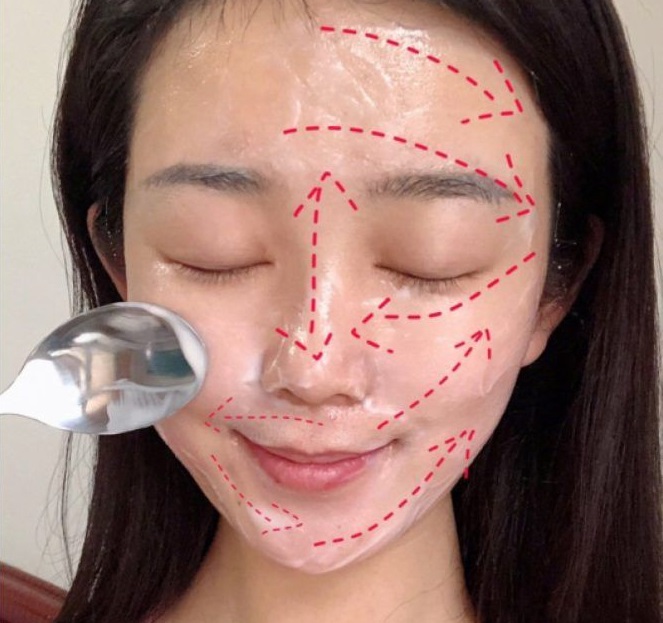 Step 4:将灌肤乳液厚敷在脸上,轻轻按摩3分钟。