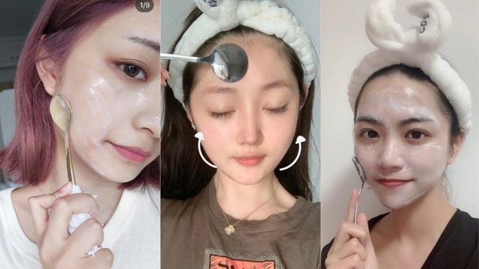 Step 5:用匙羹从下巴往上推,刮掉多余的灌肤乳液。重复步骤4及5三次,再用清水洗脸。