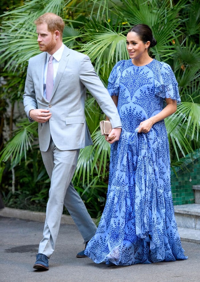 Meghan Markle的穿搭风格总会随着到访地区的文化而改变,与摩洛哥国王见面时,Meghan则以一 袭蓝色CH Carolina Herrera碎花长裙配搭Dior手拿包现身。这位准妈妈把整个造型的正式与休闲感之间的比例拿捏得相当好,舒适轻松之余也很亮眼。