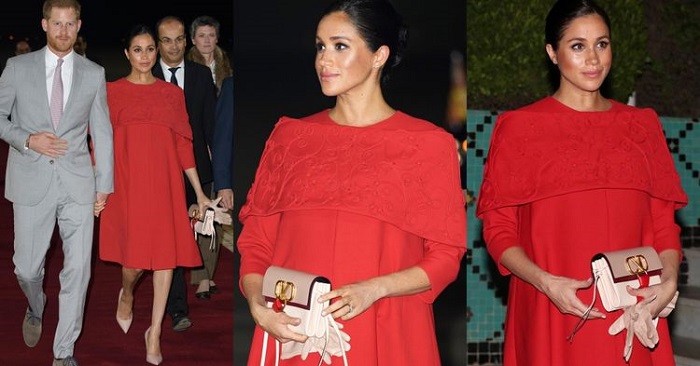 Meghan Markle穿着由Valentino Haute Couture创意总监Pierpaolo Piccioli亲自为她设计的红色连衣裙,手拿着最新款的Valentino VRING手提包和裸色手套,衬托出这位幸福妈妈的好气息。脚上的裸色高跟鞋不会抢走礼服的风头又能隐形增高,看似简单的穿搭却充满细节 。