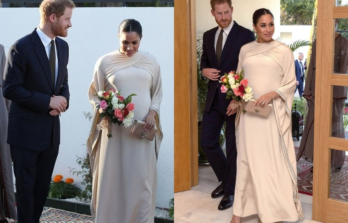 Meghan Markle在摩洛哥出席晚宴时特意选来一件高贵温婉米白色Dior订制礼服,衬上裸色手拿包和尖头高跟鞋。首饰选择方面则比较低调,Meghan只戴上订婚戒指和加拿大品牌Maison Birks的钻石耳环。