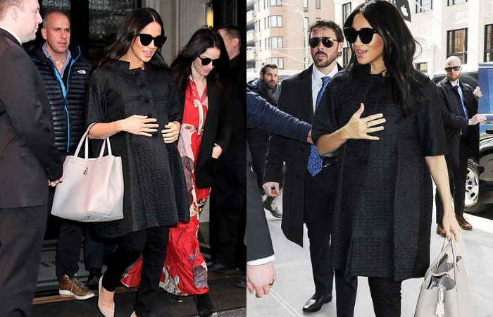 早前Meghan Markle回到纽约市,以美式造型庆祝Baby Shower。邀来一群好友共进午餐时,戴上Le Specs太阳眼镜的Meghan穿上William Vintage Courrèges的高级订制大衣配Hatch孕妇牛仔裤,手提着CH Carolina Herrera裸色手袋,犹如纽约名媛一样气质十足!