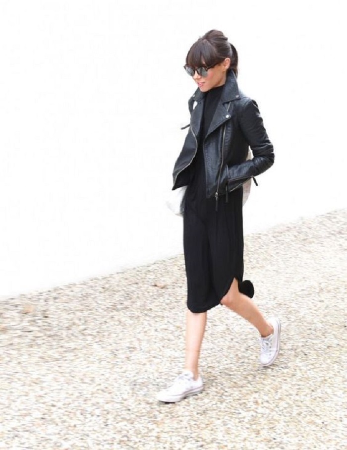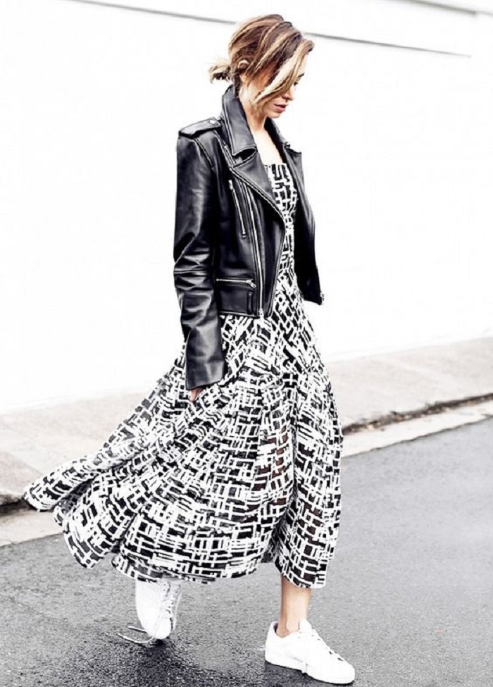 修身的黑色皮革外套,无论搭配单色长裙或是花图案长裙,一样能营造内柔外刚的女生特质。