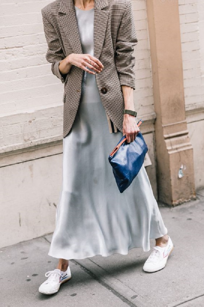 3. Oversize的西装外套不适合搭配长裙,这会导致上宽下宽的情况出现,这就弄巧反拙了。