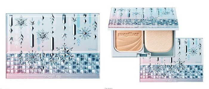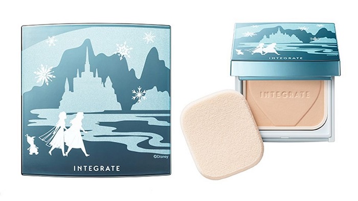 Integrate的美肌粉饼印上Olaf、Anna、Elsa散步的剪影,蓝金属光泽的外壳飘出雪地的氛围。