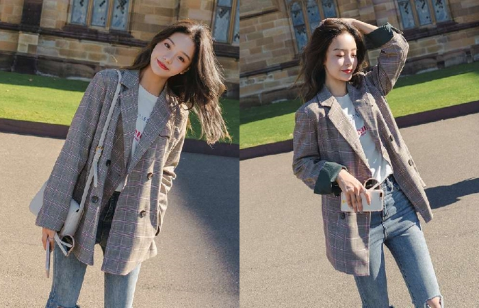 今年的小西装都是长版带复古风居多,这种版型的外套最不挑身高。复古格子小西装,小西装与经典百搭的牛仔裤混搭起来,可以说是最保险也不易出错的一种穿搭。这两种单品混搭到一起,别有一番独特的风味。