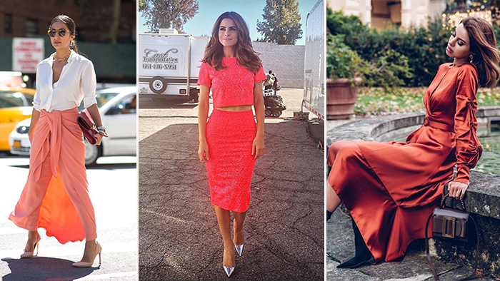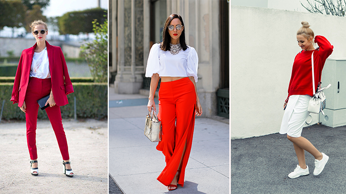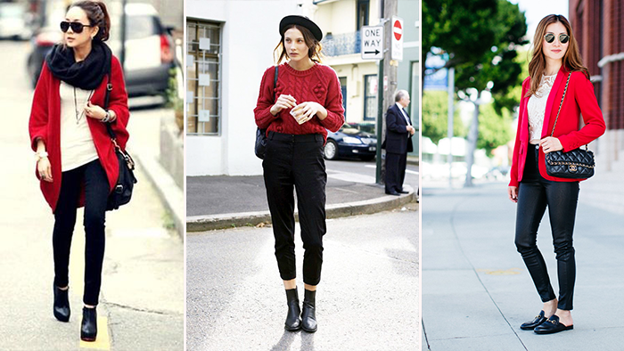 试着在外头搭个白色或黑色外套,或者选择黑色的配搭单品如包包、鞋履…中和了红色的艳,让人看起来气质些。