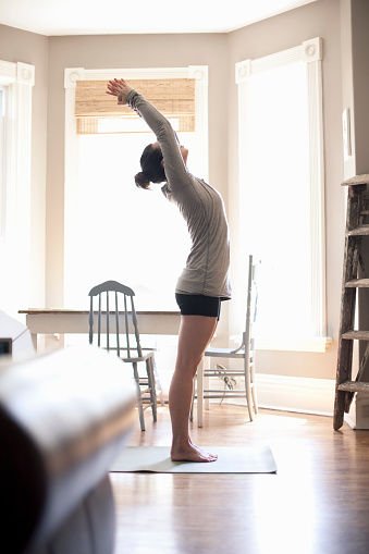双手合掌伸直向上,继续一直往后伸展,你会感觉肩膀和腰都会拉紧。保持10秒再回到原位子,每天重复做5次。