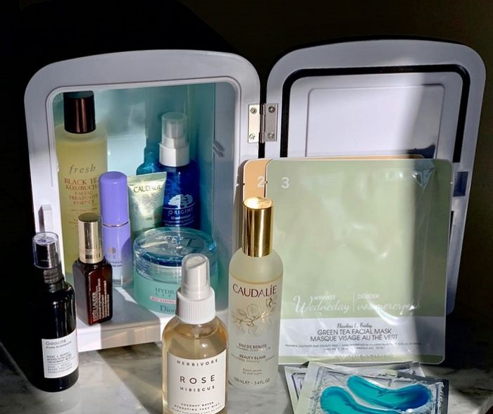 但是Beauty Fridge毕竟空间有限,不能所有护肤品都放在里面。像是这几样东西放在冰箱就very good了,面膜、喷雾、日霜、眼霜、美容工具(滚轮之类)等等,以凝胶状体最合适存在冰箱,这样能更加提升舒缓效果和凉快感。