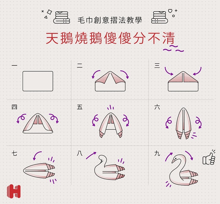 当然,如果你想整个视觉更加分的话,可以在床铺上来点创意摆设。例如说将毛巾变成天鹅,蜜月房指定的摆设,贴上教学图大家一起学看看咯!