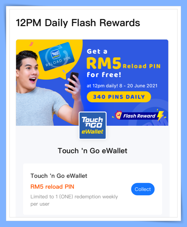 如果你是TNG eWallet用户注意了!从即日起至6月20日,每日推出“Daily Flash Reward”活动,每天的中午12点免费送出 RM5 Reload Pin!