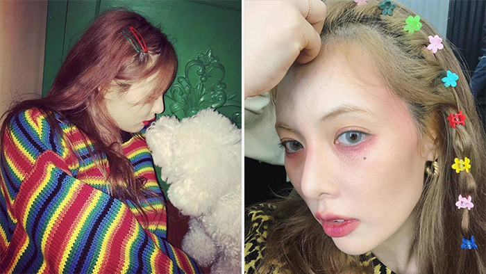 有没有觉得很熟悉?我们小时候的小花夹、彩色大扁夹都被泫雅掏出来别在头上,看来另一波复古潮又席卷而来了!