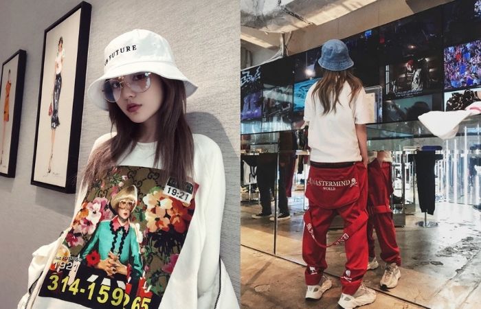 周扬青很喜欢使用各种帽子为穿搭加分,除了最普遍的棒球帽之外,渔夫帽是她爱用的帽款。带点休闲的渔夫帽很适合搭配强烈的街头风造型,有柔化整个人气质的作用,再配上复古的大眼镜,潮味十足。