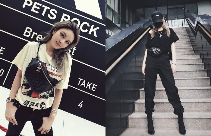 周扬青对黑色的腰包情有独钟,不管是Chanel还是Gucci的腰包都让她女人味的造型多一点帅气感,呈现中性俏皮的男孩风。