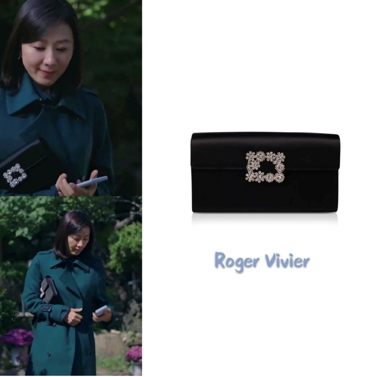 这款法国女人最爱的Roger Vivier手拿包,也多次出现在正宫金喜爱的手上。简单的手拿造型包以一颗颗水钻镶嵌而成的花朵造型作为方釦,带在身上看似低调,但又自带有奢华优雅的女王风范,小编对这款有给了无数次心心眼。