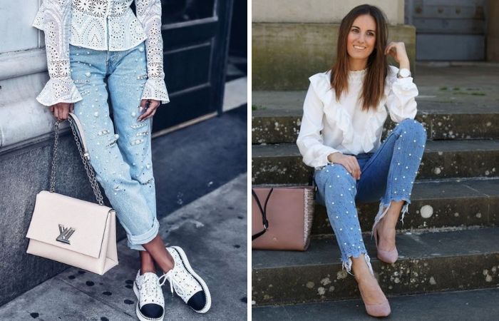 都说丹宁是永远不过时的单品,每一种样式都能让人轻松百搭。配搭上珍珠点缀的丹宁裤,给人多了一种柔美的气质,却也不会减低丹宁的街头味。建议穿这类珍珠丹宁裤时,上衣尽量挑女性化的材质如荷叶袖、蕾丝、纺纱款等会更能带出整体OOTD美感。