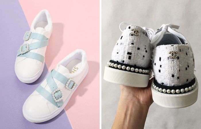 除了高跟鞋,出现在市场中的珍珠运动鞋也让人眼前一亮。精美的珍珠不浮夸地满满点缀于整双鞋面上,而是选择性地装饰,为休闲鞋增添了一抹华丽的气息。