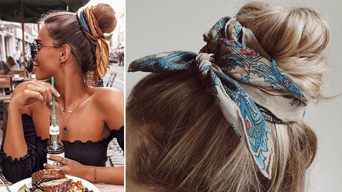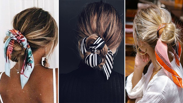 打造复古感发型,不管长发或短发,低马尾或丸子头,只要一根丝巾就能营造温柔迷人的气质。