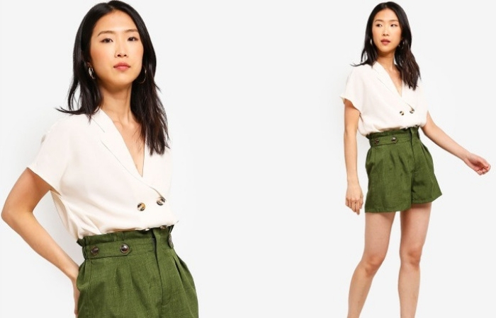 贾静雯身上这件蓝绿色棉质衬衫上,领口处的特殊设计让衬衫变得更有趣,刚刚好的露出些微胸前肌肤也增添一点性感的味道,正式之外又具备时尚感。