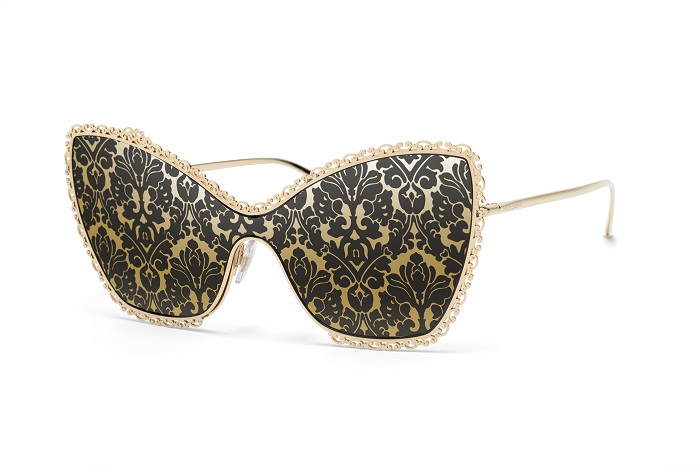 这款超大轮廓太阳眼镜性感迷人,彷佛一个美丽高贵的青铜面罩覆盖眼部四周。金色镜片上以丝网印刷技术缀以银色锦缎图案,而镜框上的巴洛克蕾丝图案则令整个设计添上几分迷人精致的美感。