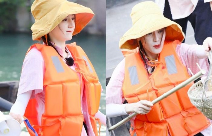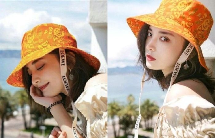 中国女演员娜扎最近就戴了一顶鲜亮的印花款式,而且相对一般的渔夫帽加宽了帽檐,配上两边LOEWE的Logo系带,本来不大的脸又小了一圈。