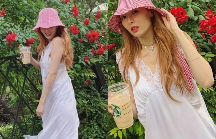 相比迪丽热巴的单色的渔夫帽,一顶渔夫帽在泫雅身上却充满了甜蜜的感觉,跟平日的性感造型大不同,多了一份可爱俏皮感。