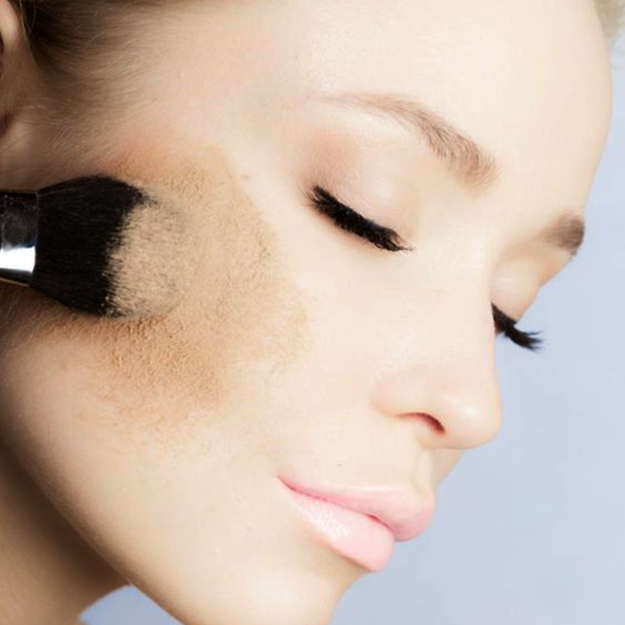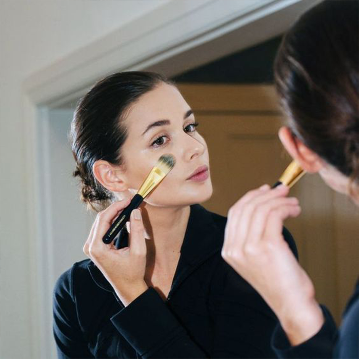再上粉底液之前,确保自己面部泛红、黑眼圈等问题都被遮瑕膏处理好了,尤其在痘印、斑点处一定要适量涂抹遮瑕膏,接着选择轻薄的粉底液,用刷子顺着肌肤纹理轻轻均匀刷开。