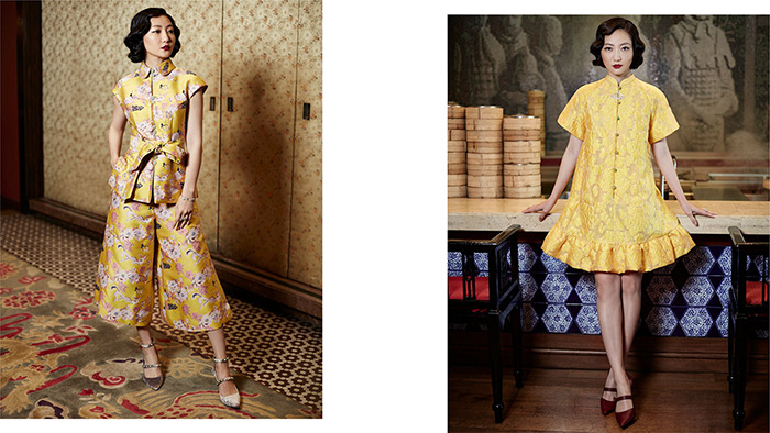 近几年大热的宽松的palazzo款裤子也被纳入KHOON HOOI QI PAO 2019系列中,搭配亮眼的皇家黄色锦缎的束带上衣,让时尚和传统结合;而夸张的梯形连衣裙则采用代表性的旗袍工艺,并配上花卉布料纽扣和锦缎。