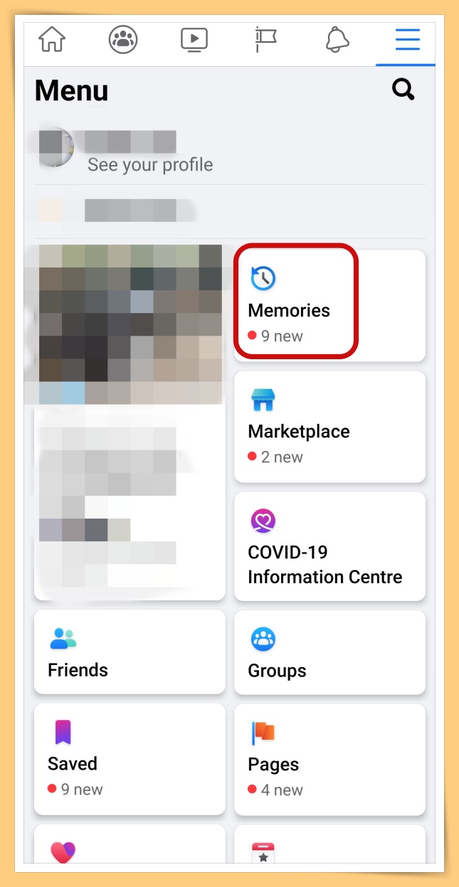 ▶️ 点选Facebook应用程式中的 「功能表」,然后点击Memories