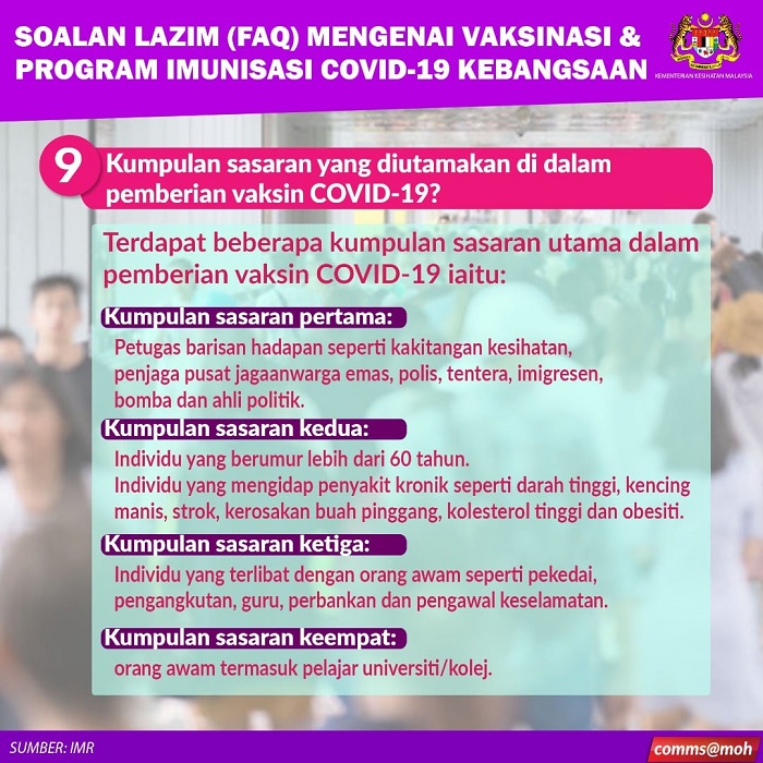 除此之外,首相也说为实现群体免疫的目标,预计至少60至70%(约2000至2300万人)的国人必须接种疫苗。昨天,卫生部也在脸书上发布了有关“全国冠病疫苗接种计划” 群体Q&A中,优先获得注射的群体分为4个阶段。