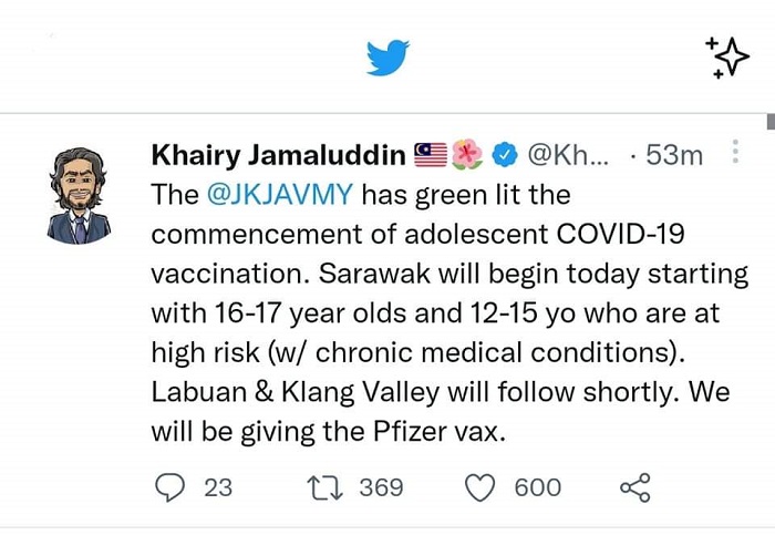 卫生部长早前宣布,12至17岁的青少年即将开始接种疫苗,由于砂州已达到80% 成年人完成接种目标,所以青少年接种计划也会从砂州先开跑。已为家里青少年登记的家长们可以准备就绪,估计大家陆续收到通知了。