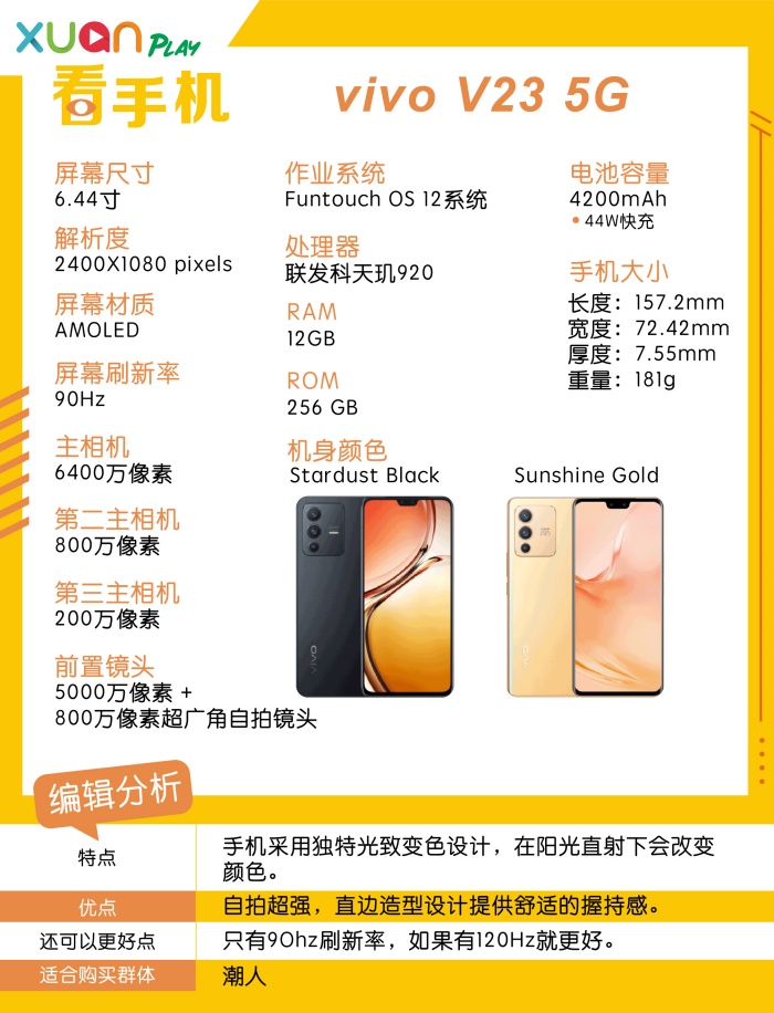 vivo V23 5G屏幕为 6.44 寸 FHD+AMOLED 的屏幕,配备 90Hz 刷新率。在机身厚度和重量方面, Sunshine Gold 为 7.55mm 和 181g;Stardust Black 则为 7.39mm 厚度和 179g 。