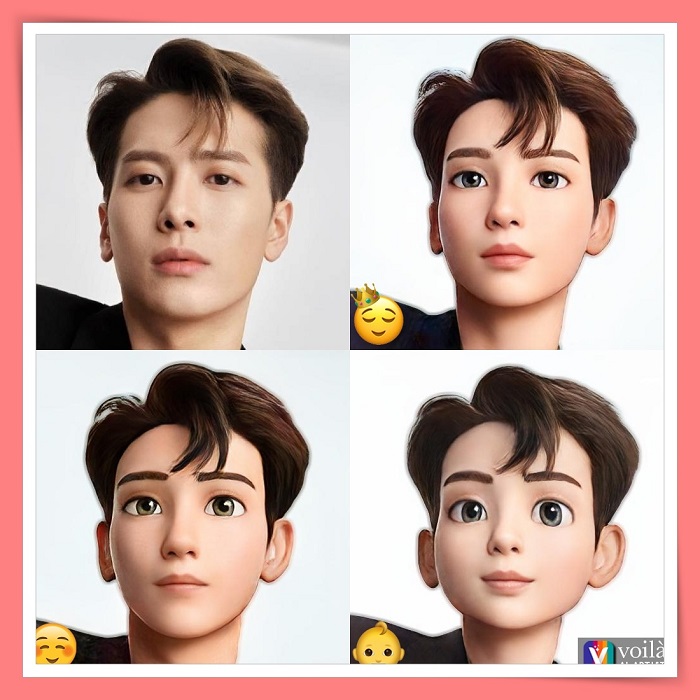 我们就拿帅气的王嘉尔来做示范,经过几秒的时间就转换出一张原图搭配三种风格的3D卡通人物头像,你可以随着个人需求选择要储存这张组合图到相簿,或选择单一图示进行储存。