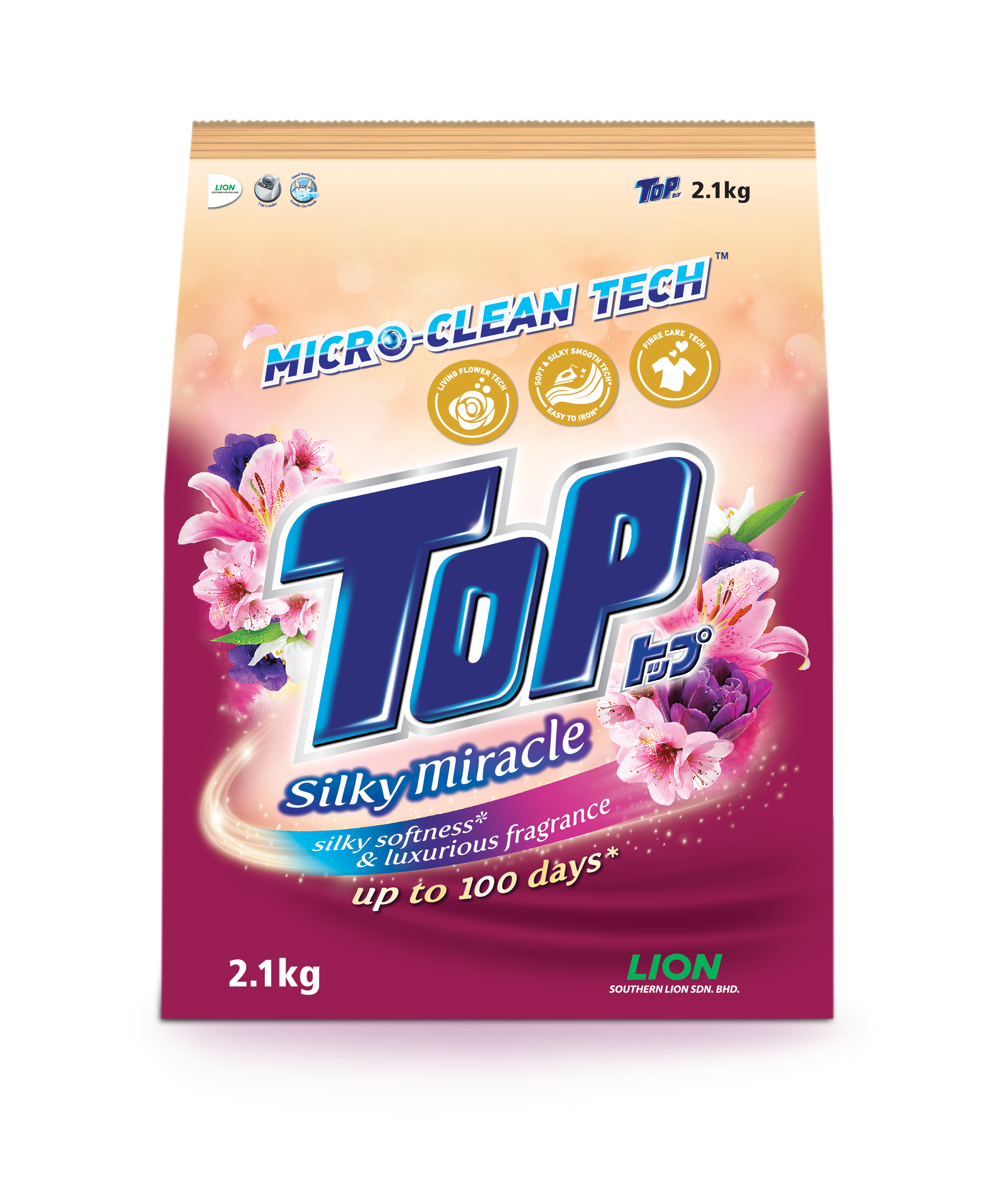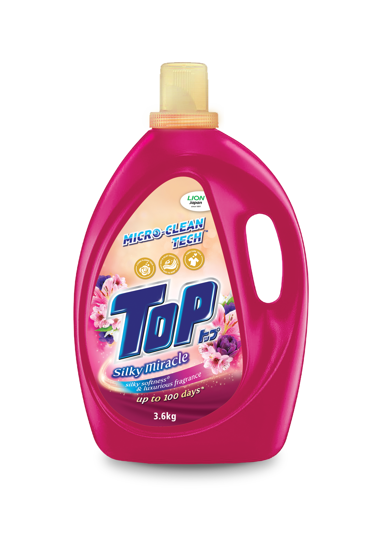 采用日本先进洗衣科技配方的 TOP Silky Miracle 洗衣剂,在洗涤过程中呵护以及使衣物保持洁净,因此衣物亮丽如新更加持久。其突破性的“Soft & Silky Smooth”柔软和丝滑科技,令衣物滑顺易烫,绵软舒适。 通过“Living Flower Technology”, 以可持续性方式采集沁香,带来奢华诱人的独特香气体验。