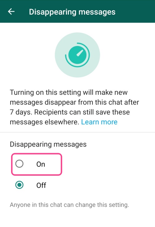 ⭕ 选择On,7天后将会删除你和联系人之间的对话。