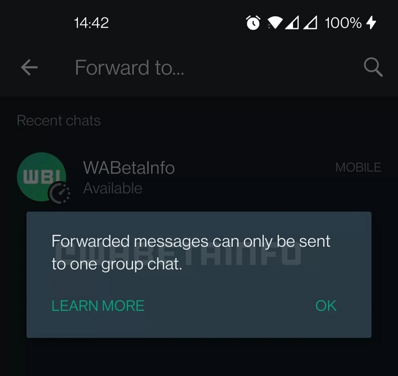现在很多人喜欢把收到的信息转发到WhatsApp群组分享,因此转发功能已经被滥用,于是WhatsApp开始测试新功能,限制可以转发消息的次数,一次只能将信息转发到一个群组。