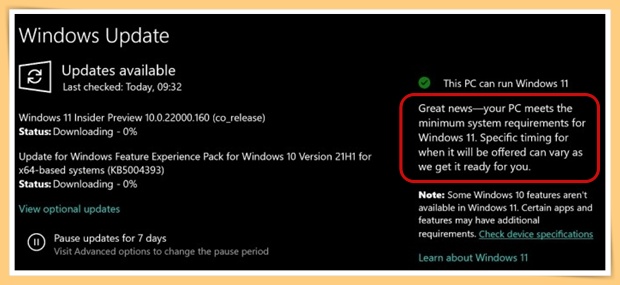 从实际提示中可以看见:“好消息–你的 PC 符合 Windows 11 的最低系统要求。在我们为您准备好的过程中,何时提供的具体时间可能有所不同。”