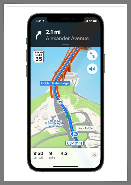 Apple在iOS 15地图上结合了 AR 模式指引功能,透过 3D 数据更新地图软体,提供更多城市 3D 地图精细度和详细交通资讯,地球显示与夜间模式。新增人行道及自行车道的导航细节,驾驶在导航时能清楚辨识。