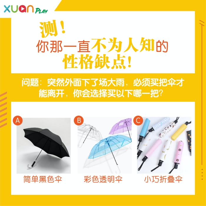 你觉得你很了解自己吗?或许你心理有着某些性格缺点一直困扰着你但你不自觉,但只要有天发现,才知道原来自己存有你从没发现的个性。简单的选一把伞吧,来揭开你隐藏已久的性格缺点!