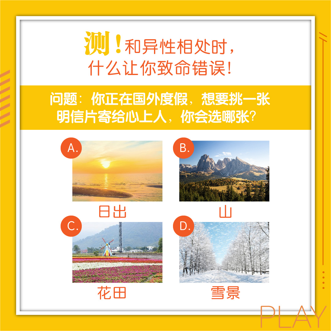 问题:你正在国外度假,想要挑一张明信片寄给心上人,你会选哪张?