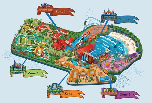 占地25英亩的水上乐园一共拥有5个主题区,分别是 Penawar Falls、Penawar River、Shipwreck Reef、Tidal Wave 和 Kids Ahoy,占地超旷的主题乐园可容纳多达1万2000名游客,应不同年龄层的需求而设计出不同的主题区,任谁都不会越玩越寂寞!