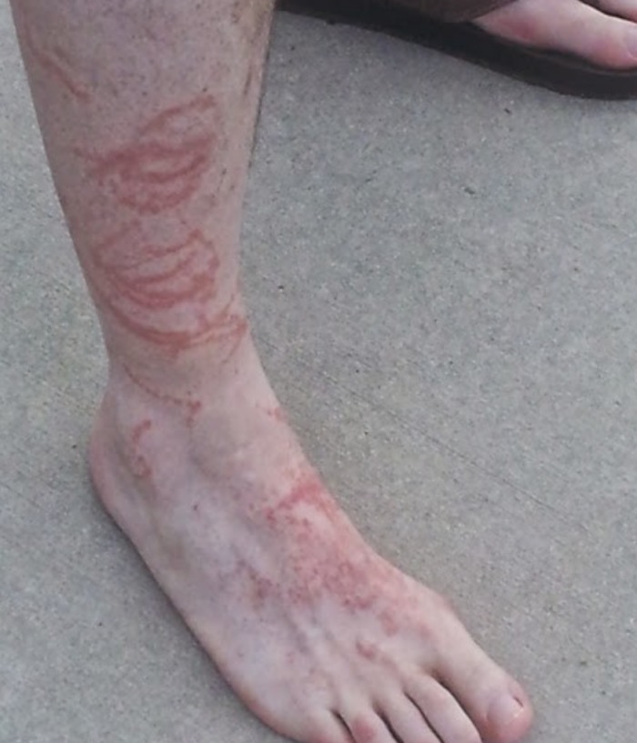被水母蛰伤后的肌肤表层会开始出现局部疼痛,数小时后会出现条状红斑,类似鞭痕那样,如果更严重的话,会出现水疱、淤斑、表皮坏死等,有些患者还会有发冷、肌肉酸痛、恶心、胸闷等,重者可能会发生休克和肺水肿。
