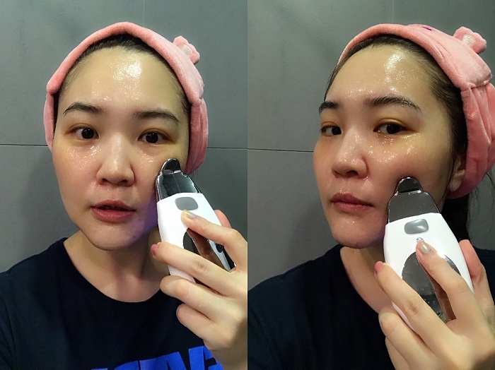 第一步先把白凝胶涂上脸,开启Spa机的1档(手要稍微沾湿)。1档是负电流,将白凝胶推入肌肤,乳化并包裹基底层的污垢。也就是说透过机器和产品,帮助我深层洁净,据说可以直达第七层肌肤,好劲啊!!